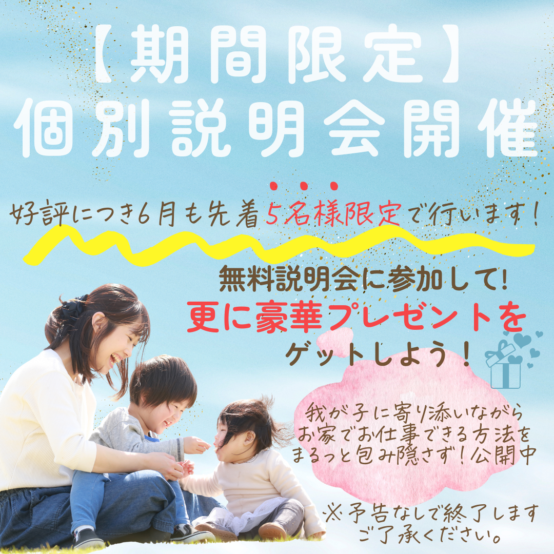 もしあなたが、下記に一つでも当てはまるのであれば、ぜひ一度説明会にご参加ください。イライラしない育児法や在宅で収入を増やしていくためのヒントをたくさん掴み取ることができるはずです。