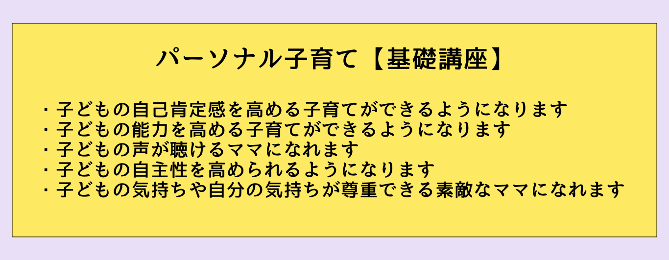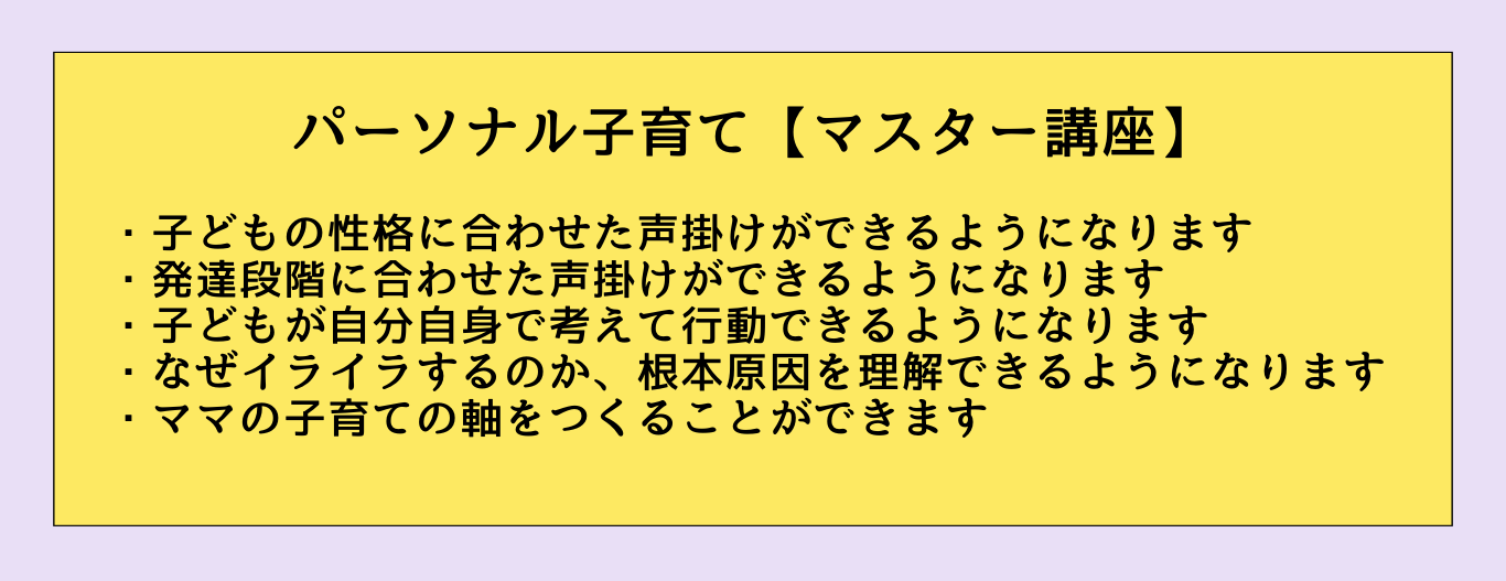 | パーソナル子育て基礎・マスター講座 | ・子どもの能力を最大限発揮できる親になるための心構え、子どもの発達段階の知識、性格や発達段階に合わせた声掛け方法、子育ての軸をつくる、感情のコントロール
